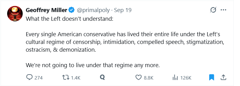 According to Miller, the misrecognition suffered by American conservatives amounts to more than penalties for overstepping the boundaries of acceptable speech. The entire system of education and communication that ostensibly subjects non-progressives to the “regime” of progressive ideology is implicated. With the passing of Twitter (as X) into the hands of Elon Musk and the Trump administration’s rapidly accelerating willingness (particularly since the Kirk shooting) to turn state repression mechanisms onto its ideological enemies and directly target liberal institutions and the left, that system is coming to an end.48